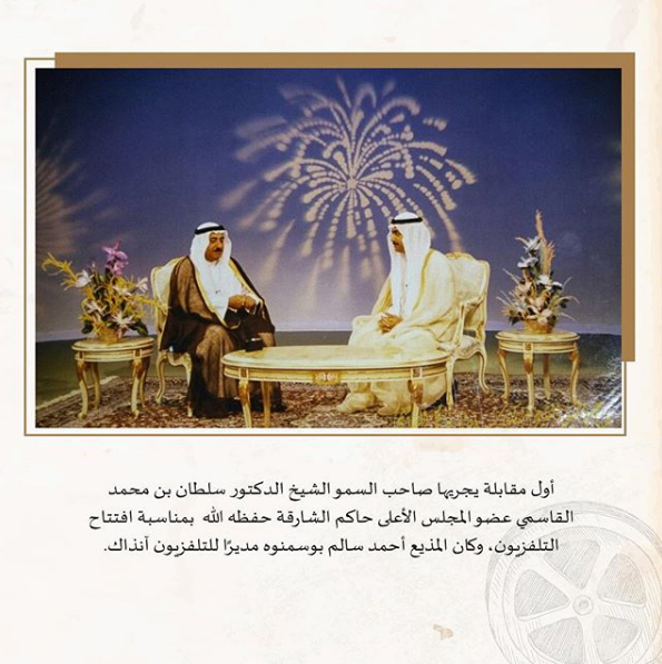 أول مقابلة يجيريها الشيخ سلطان بن محمد القاسمي، عضو المجلس الأعلى حاكم الشارقة، بمناسبة افتتاح التلفزيون.