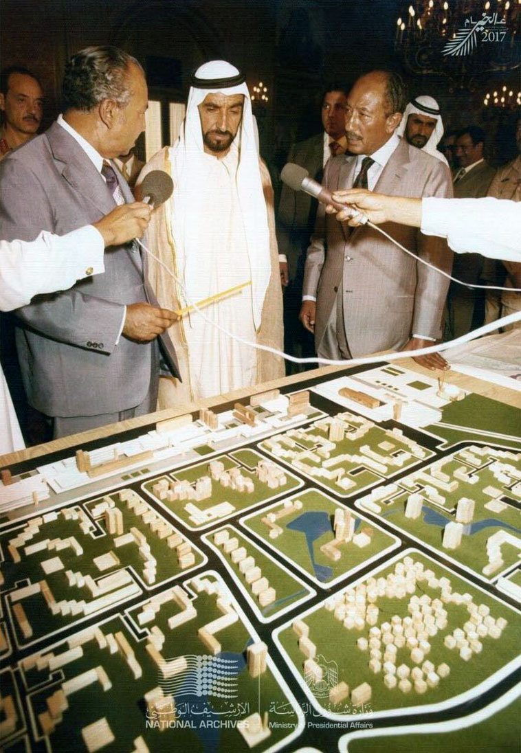 الشيخ زايد بن سلطان يستمع لشرح عثمان أحمد عثمان وزير الإسكان والتعمير لمجسمات مدينة الإسماعيلية ومدينة زايد بها في أغسطس 1974