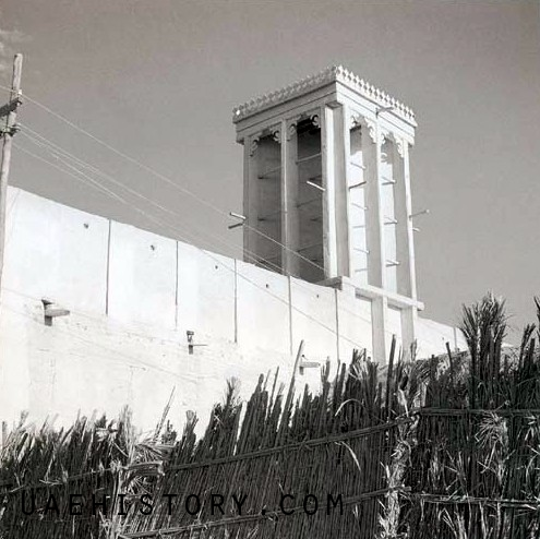 منزل في دبي القديمة يعلوه برجيل الهواء عام 1960، وتبدو أسلاك أول شبكة للكهرباء تم تمديدها