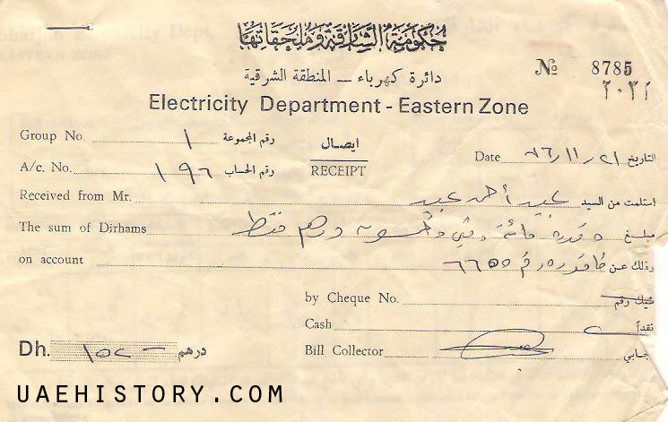 وصل دفع فاتورة الكهرباء صادر عن حكومة الشارقة وملحقاتها عام 1976