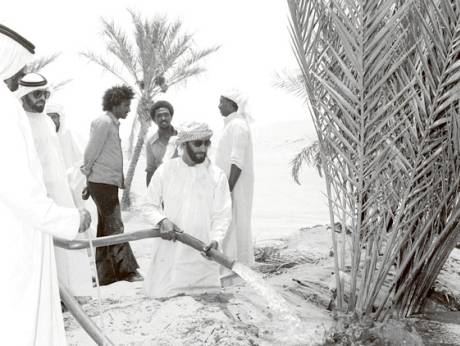 الشيخ زايد يسقي نخلة في ليوا خلال زيارة له عام ...