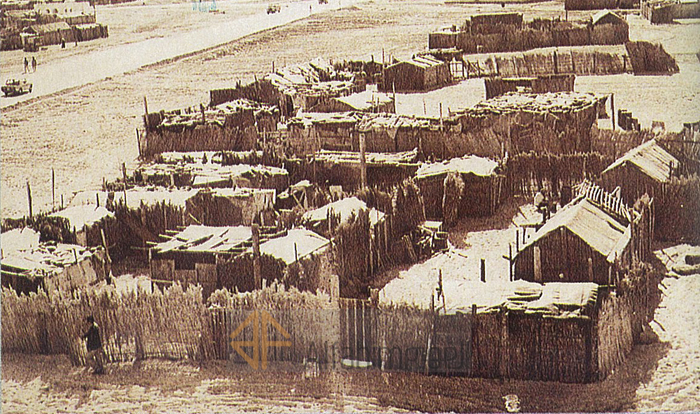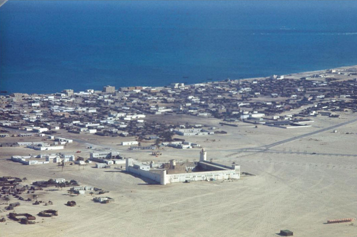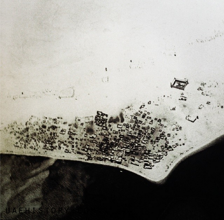 أبوظبي من الجو عام ١٩٤٩، ويظهر قصر الحصن في يمين