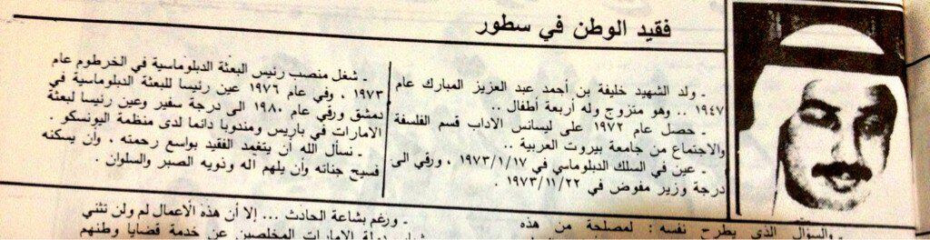 قصاصة من مجلة تتحدث عن الشهيد السفير خليفة المبارك