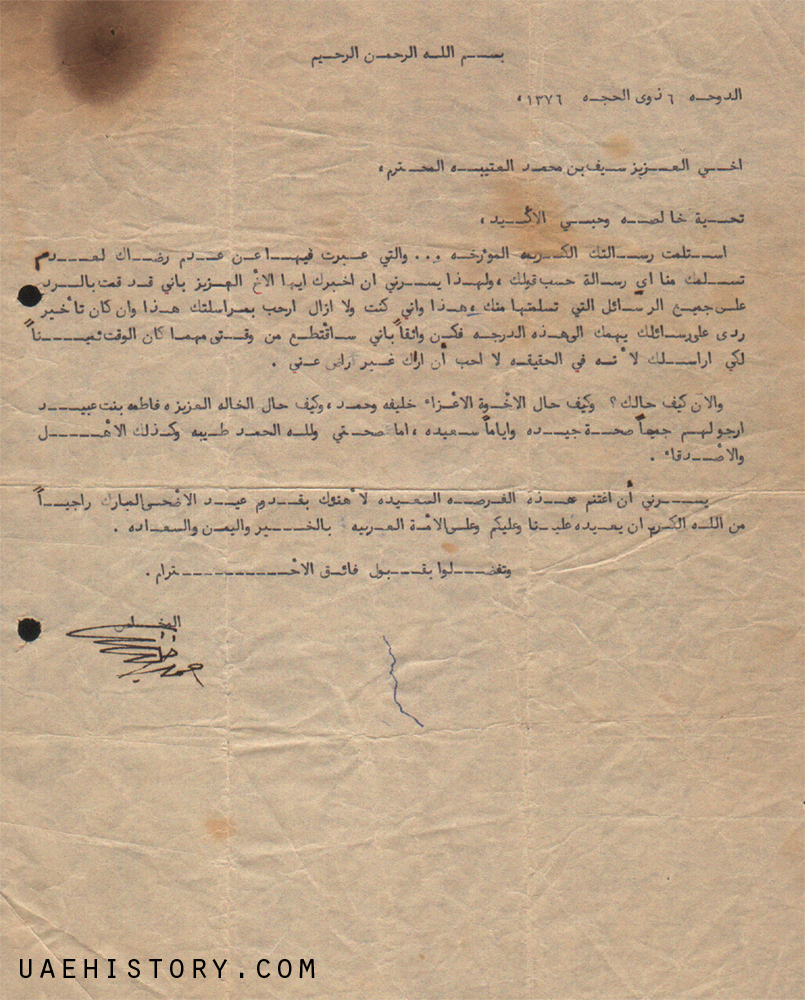 艾哈迈·哈利法·苏维迪于1957年写给赛义夫·莫哈马德·艾尔的信