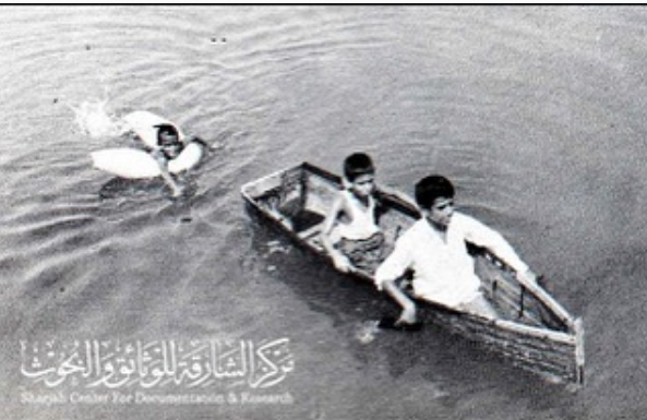 أطفال في خور الشارقة عام 1970 يلعبون في قارب ...